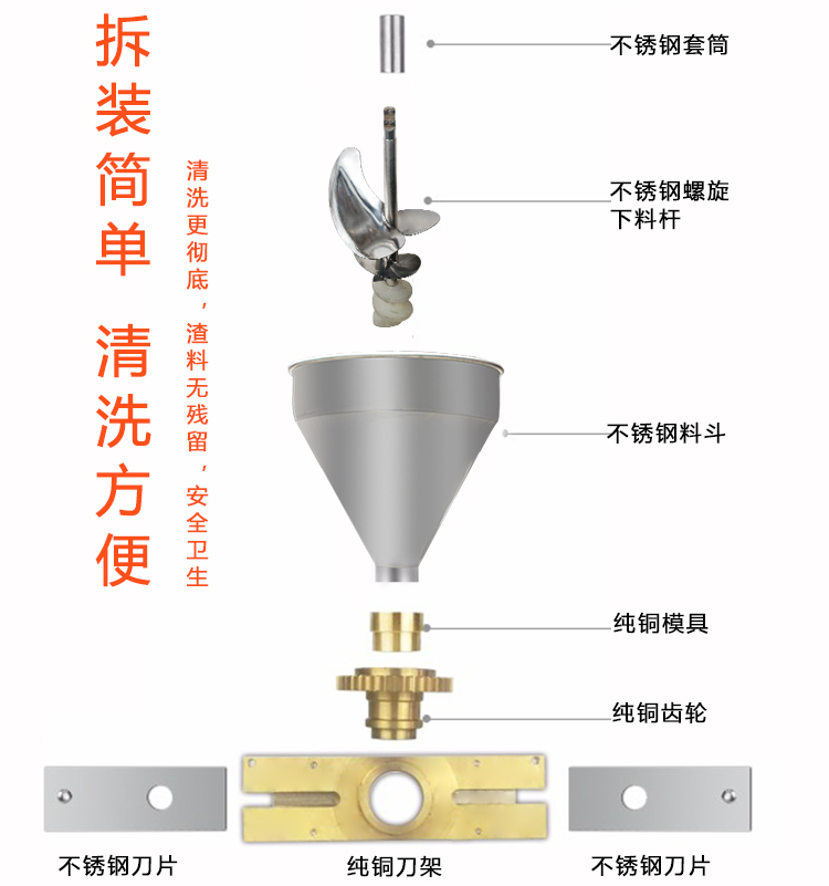 拆裝簡單:采用不銹鋼套筒與螺旋下料桿設(shè)計(jì),清洗更徹底,渣料無殘留,安全衛(wèi)生。不銹鋼料斗與純銅模具配合,確保生產(chǎn)過程干凈衛(wèi)生。