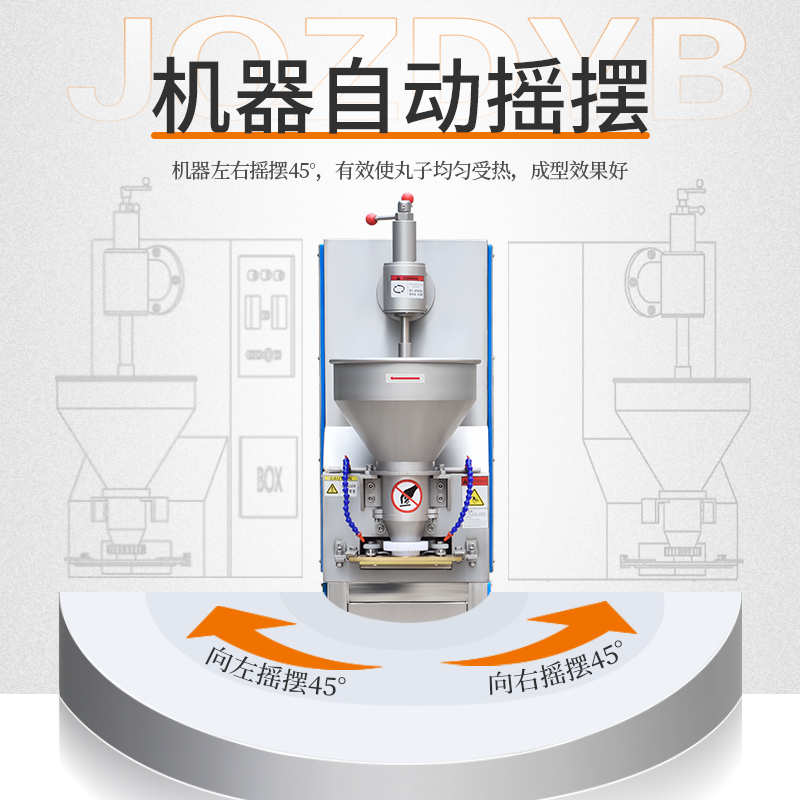 機器自動左右搖擺45°,總旋轉角度達90°。搖擺功能使丸子在成型槽中滾動更均勻,避免粘連,確保丸子形狀統(tǒng)一。